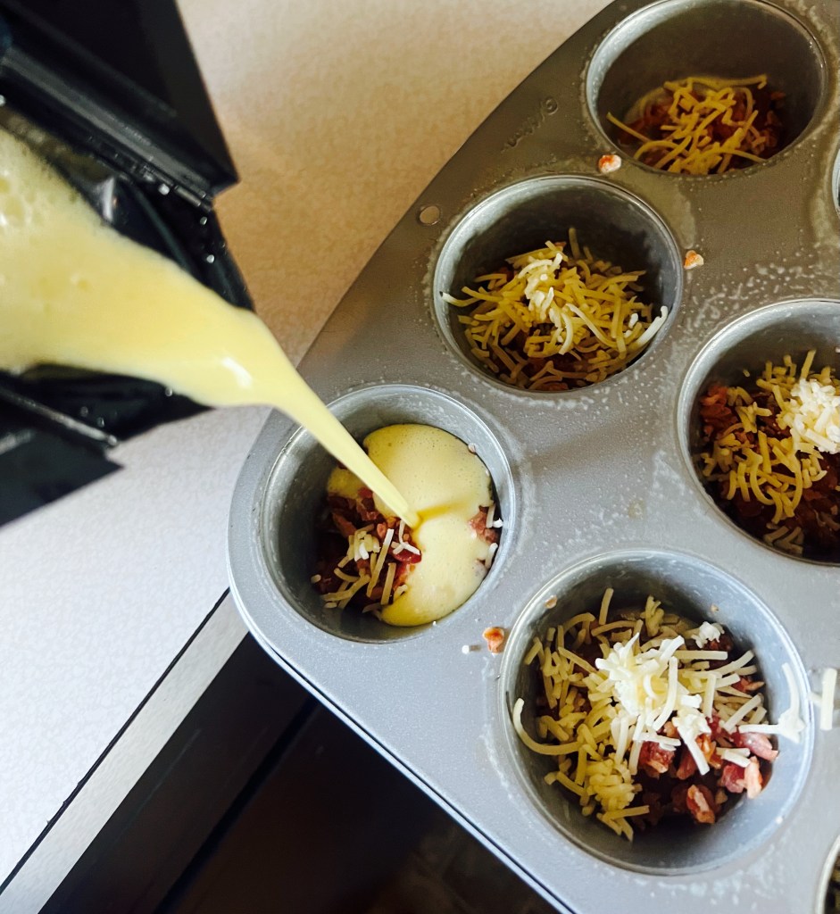 4. Pour your egg mixture on top of your cheese and bacon. You want to fill them about 3/4 full.