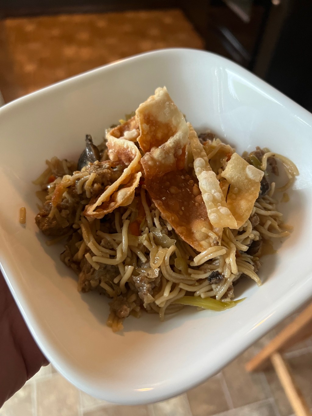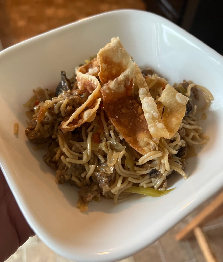 6. Once thoroughly mixed together, dish up your Egg Roll Pasta and top with your crunchy egg roll sheets. Enjoy!